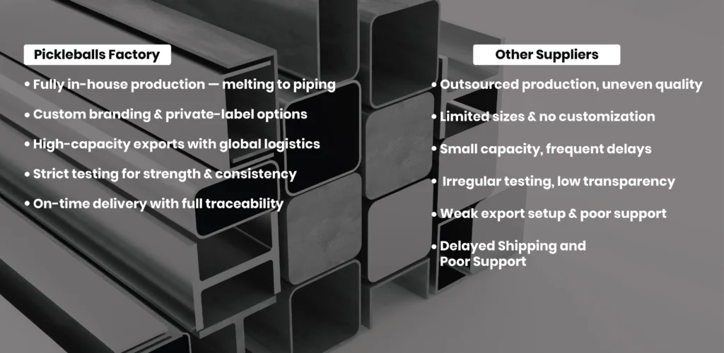 We offer customized pipe sizes, wall thicknesses, coatings, and branding options. ND Steel specializes in private-label and OEM manufacturing for global distributors and industrial suppliers. - Corrosion-Resistant & Long-Lasting