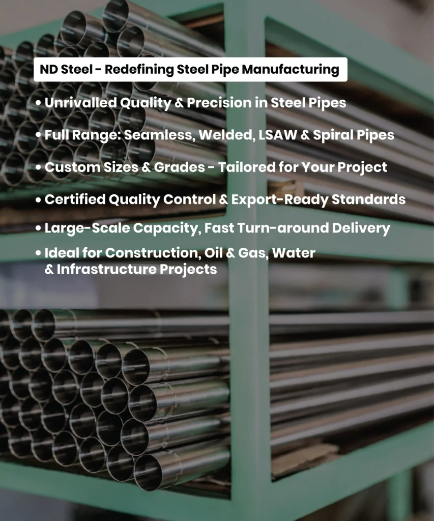 Upgrade your supply chain with ND Steel’s premium range of seamless, welded, and galvanized steel pipes — perfect for bulk orders, global exports, and customized branding. Trusted by importers, distributors, and industrial clients worldwide, we combine precision manufacturing with unmatched reliability.